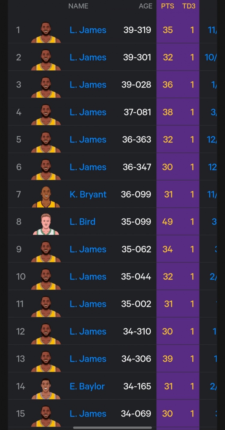 據(jù)統(tǒng)計,在NBA歷史最年長球員30分三雙榜單上,詹姆斯“超越”自己排名第一,排名前六都是老詹,科比36歲99天排第7。