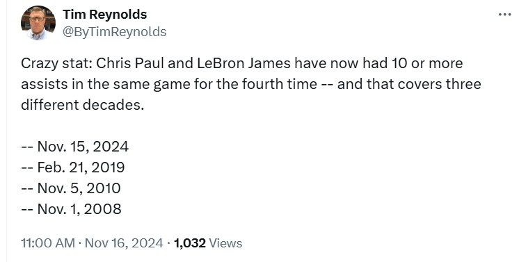 據(jù)統(tǒng)計(jì),詹姆斯和保羅生涯有4場(chǎng)對(duì)戰(zhàn)助攻都上雙,其中涵蓋了最近三個(gè)十年段。