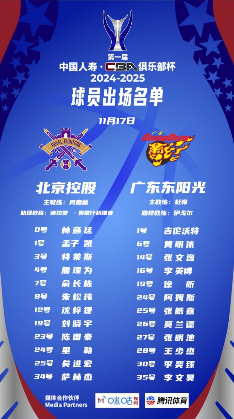 11月17日訊 CBA俱樂(lè)部杯,北控對(duì)陣廣東。賽前雙方公布了本場(chǎng)名單,“云南滑翔機(jī)”矣進(jìn)宏在列。
