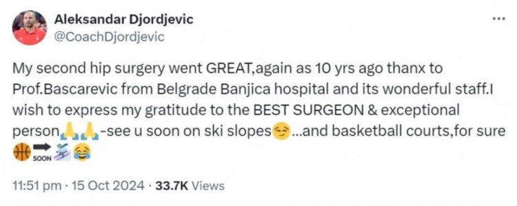 喬爾杰維奇回國(guó)以后在10月份接受了一個(gè)髖關(guān)節(jié)手術(shù),看上去恢復(fù)的不錯(cuò)