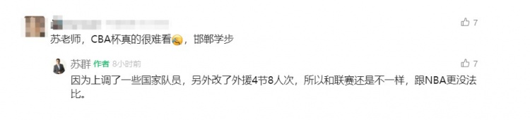 蘇群回應(yīng)道:“因為上調(diào)了一些國家隊員,另外改了外援4節(jié)8人次,所以和聯(lián)賽還是不一樣,跟NBA更沒法比。”