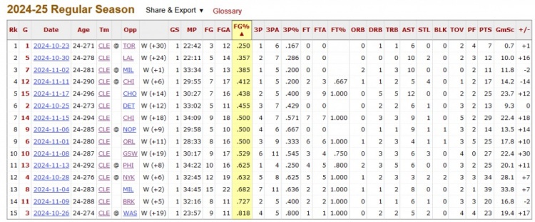 而在本場之前,加蘭賽季最鐵的一場比賽,命中率也有25%。本場21中3命中率只有14.3%。