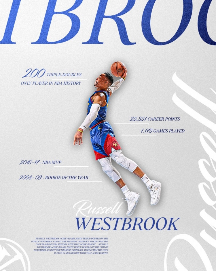 11月21日訊 昨日NBA杯小組賽,掘金在客場以122-110擊敗灰熊,威少斬獲生涯第200次三雙。