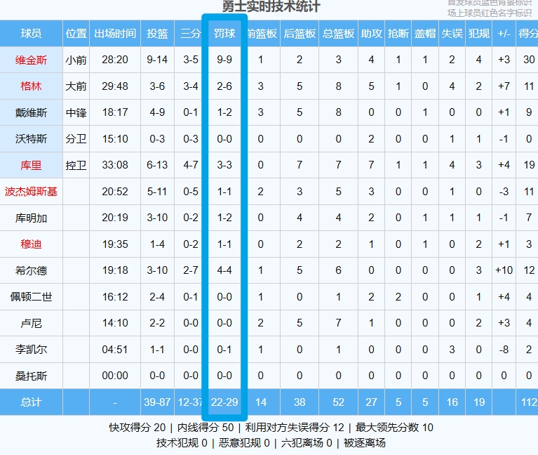 本場(chǎng)比賽,勇士罰球29中22,命中率達(dá)到了76%,比自己的賽季平均水平高了6個(gè)點(diǎn),其中維金斯9罰全中!