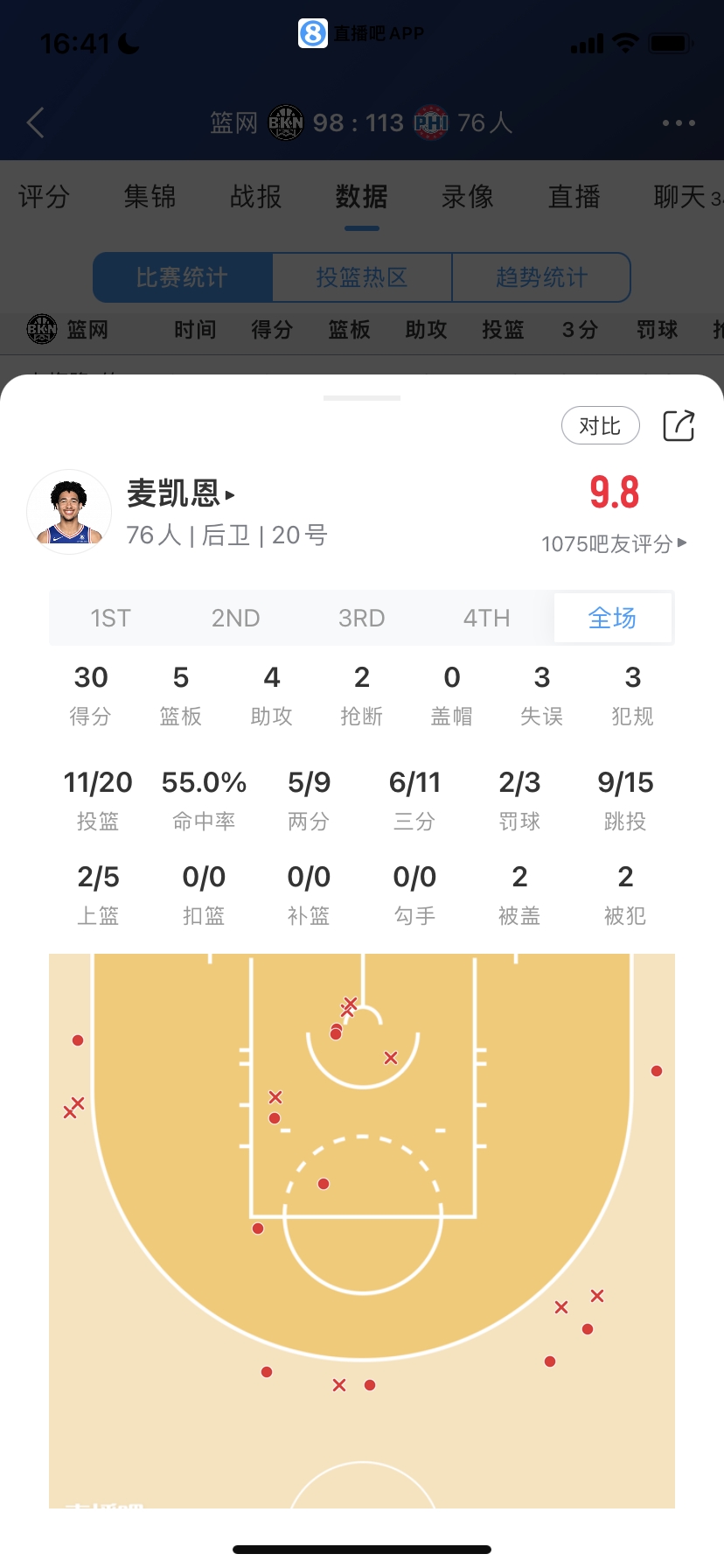 76人16號秀 賈里德-麥凱恩 上陣38.7分鐘 連續(xù)7場20+