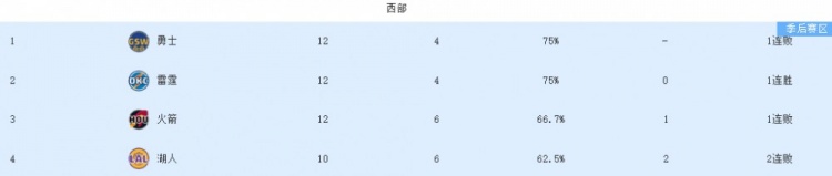 輸球之后三支球隊(duì)的排位沒有變化,勇士排第1、火箭第3、湖人第4。