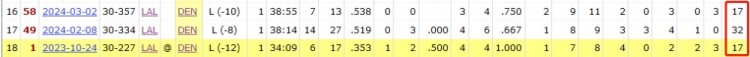 而在上賽季,濃眉在常規(guī)賽3次面對(duì)掘金,也有2場(chǎng)比賽得分不到20分。
