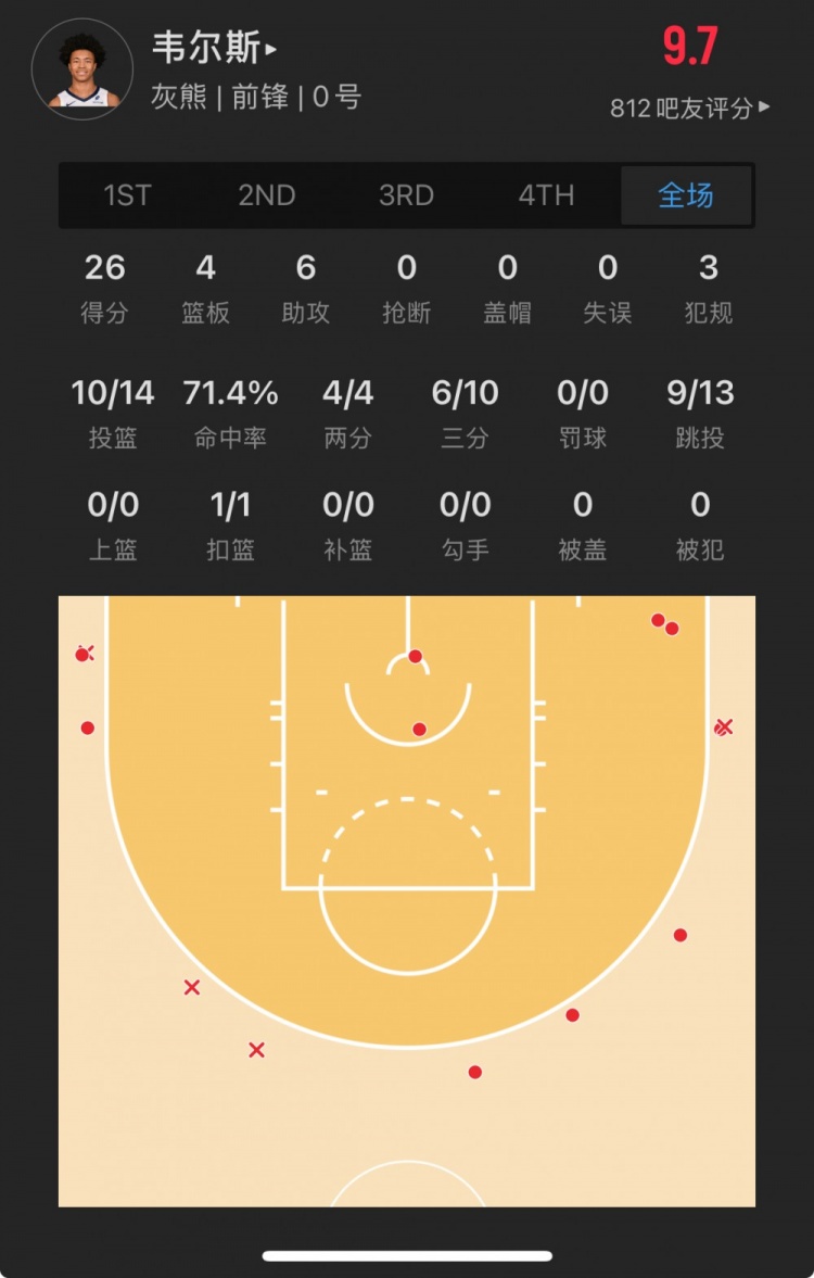 灰熊39號(hào)秀 杰倫-韋爾斯 登場(chǎng)31.6分鐘