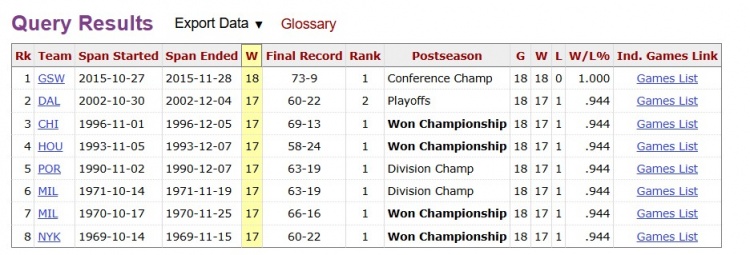 此前8支球隊分別是2015-16賽季的勇士、2002-03賽季的小牛、1996-97賽季的公牛(奪冠)、1993-94賽季火箭(奪冠)、1990-91賽季開拓者、1971-72賽季雄鹿、1970-71賽季雄鹿(奪冠)、1969-70賽季尼克斯(奪冠)。