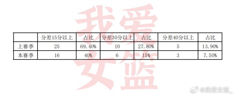 我愛女籃對比了上賽季常規(guī)賽前4輪(共36場)的數(shù)據(jù),發(fā)現(xiàn)本賽季分差15分以上的比賽,僅占比40%,而上賽季占比為69.4%;本賽季分差30分以上的比賽,占比從27.8%降低到了15%;分差40分以上的比賽,則從13.9%降到了7.5%??梢钥吹剑@3個分差區(qū)間內(nèi)的比賽,本賽季減少了40%還要多。如果分差縮小意味著精彩激烈程度提高,那么我們可以說,本賽季的精彩激烈程度提高了40%以上。