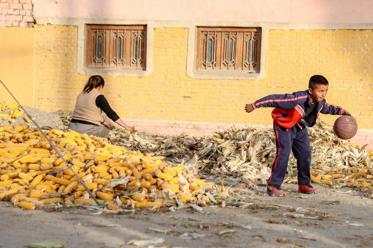 學生在農(nóng)忙時一邊打球一邊幫家里掰玉米皮