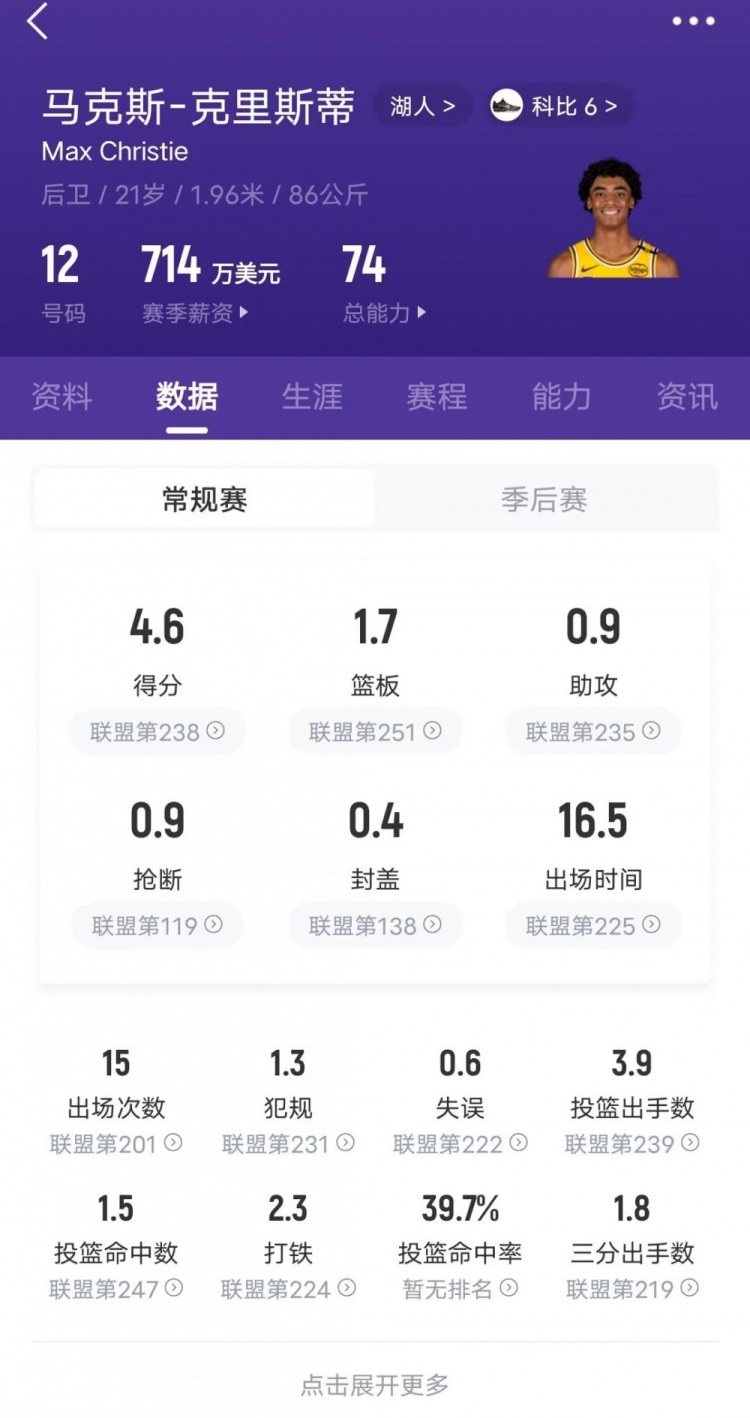 相比下來,克里斯蒂為湖人出戰(zhàn)15場比賽,場均貢獻4.6分1.7籃板0.9助攻,三項命中率39.7%/29.6%/83.3%。