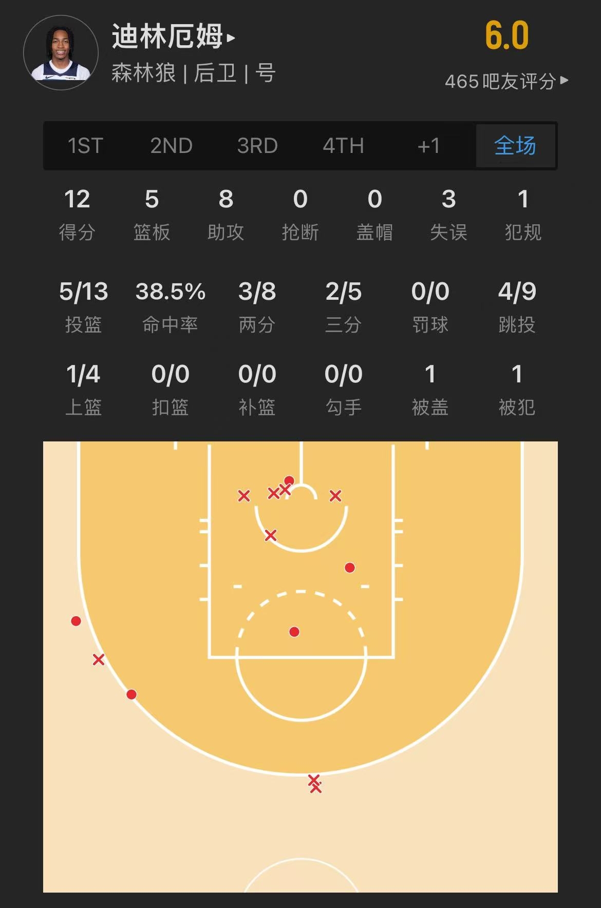 森林狼8號(hào)秀 羅布-迪林厄姆 登場(chǎng)24.5分鐘