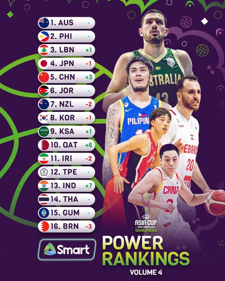 11月29日訊 今日,亞洲杯官網(wǎng)更新了亞預(yù)賽實(shí)力榜,中國(guó)男籃排名上升3位來到第5。排名前八如下: