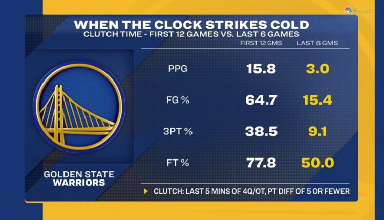 本賽季,勇士在近6場比賽關(guān)鍵時(shí)刻表現(xiàn)不佳,場均3分,命中率15.4%,三分命中率9.1%,罰球命中率50%。