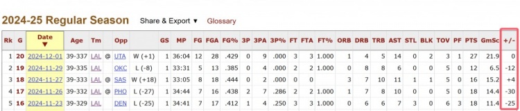 值得一提的是,在過去詹姆斯累積正負值為-91,且有三場達到-25或更低。