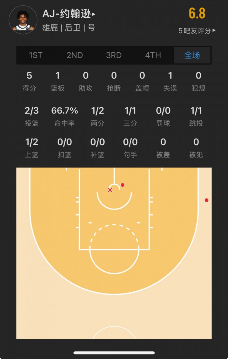 雄鹿23號(hào)秀 AJ-約翰遜 登場(chǎng)2.4分鐘