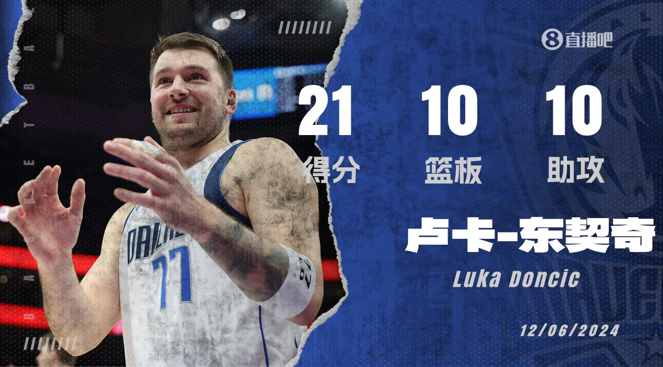 全場(chǎng)比賽,東契奇17中7砍下21分10板10助,這是他本賽季第一個(gè)三雙!