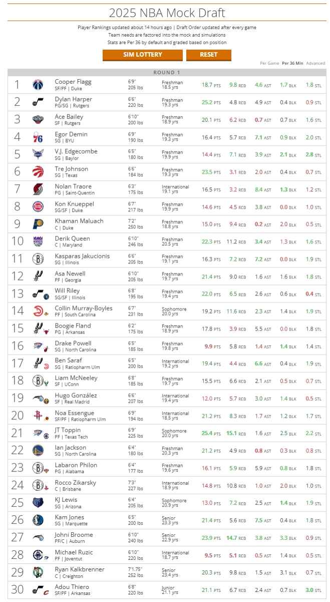 12月06日訊 知名模擬選秀網(wǎng)站Tankathon更新25年NBA模擬選秀排名,其中庫珀-弗拉格依舊穩(wěn)居狀元,榜眼則是羅恩-哈珀的二兒子迪倫-哈珀,埃斯-貝利位列探花。此前排在56順位的楊瀚森已不在榜單。