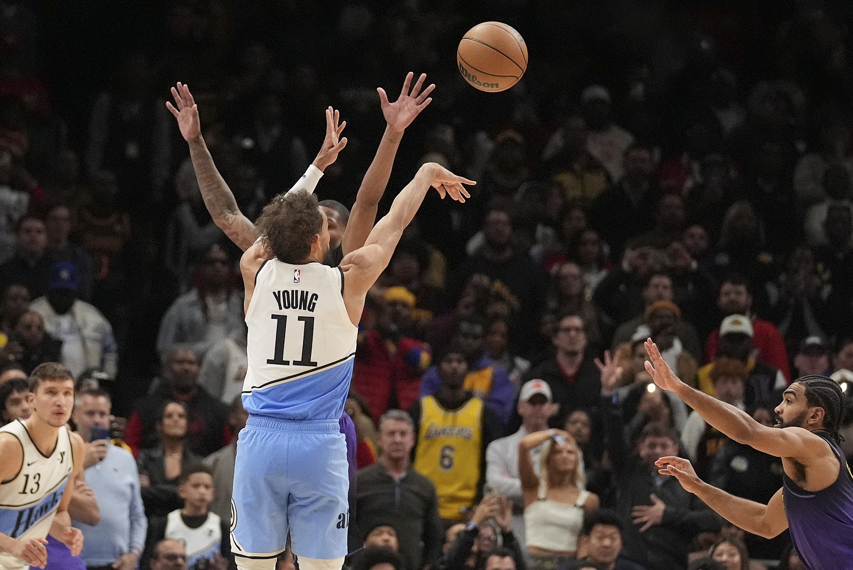 文森特與安東尼-戴維斯溝通失誤未能及時(shí)換防,兩人齊刷刷撲到了亨特面前,特雷-楊得到空位機(jī)會(huì)。楊少俠搭弓射箭,一擊斃命。