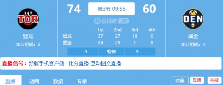 11月5日訊 NBA常規(guī)賽,掘金和猛龍的第三節(jié)正式開打。