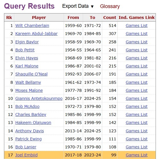 據(jù)統(tǒng)計(jì),這是恩比德生涯第100次單場(chǎng)至少砍下30分12籃板,NBA歷史第17位,現(xiàn)役第3人,僅次于字母哥(154次)和濃眉(123次)。