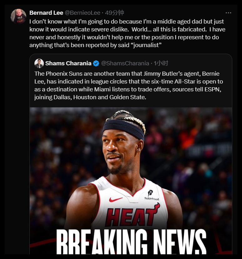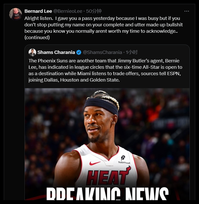 今日,巴特勒經(jīng)紀(jì)人伯納德-李更新社媒,突然對(duì)Shams展開了炮轟!