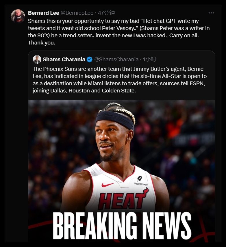 “Shams現(xiàn)在你可以說(shuō)是‘Chat GPT(AI)’幫你寫的新聞,你可以發(fā)明一種新型的‘我被黑客攻擊了’的說(shuō)法,繼續(xù)吧,謝謝!”該經(jīng)紀(jì)人連發(fā)三推寫道。