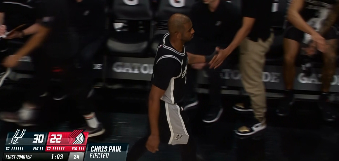 首節(jié)還剩1分多鐘時,保羅抱怨對方有犯規(guī)裁判沒吹,吃到一個T;下一個回合,保羅依舊在跟裁判抱怨,再吃一個T被驅(qū)逐。