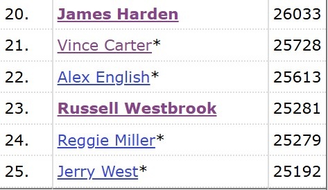 本場比賽過后,威少生涯總得分來到25281分,超越雷吉-米勒,上升至NBA歷史第二十三位。