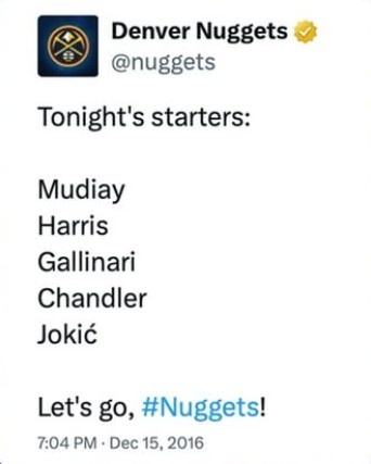 當時這場比賽的首發(fā)陣容是約基奇、穆迪埃、加里-哈里斯、威爾遜-錢德勒、加里納利。