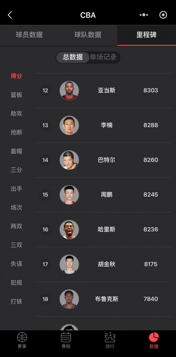 本場過后,周鵬總得分來到8270,超越巴特爾來到CBA歷史得分榜第14位。