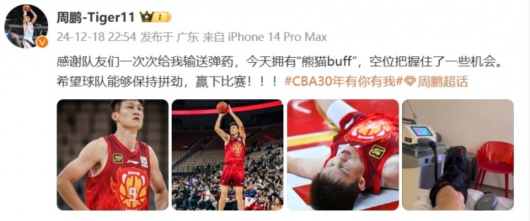 賽后,周鵬發(fā)博寫(xiě)道:“感謝隊(duì)友們一次次給我輸送彈藥,今天擁有‘熊貓buff’,空位把握住了一些機(jī)會(huì)。希望球隊(duì)能夠保持拼勁,贏下比賽!”