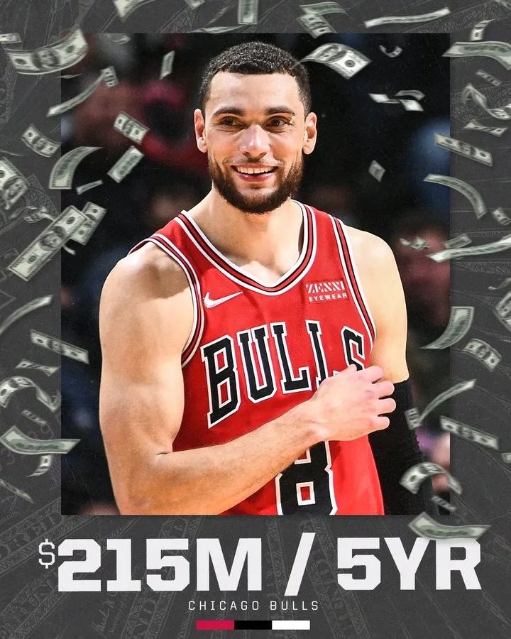 2022年夏天,拉文和公牛隊簽下5年2.15億美元的續(xù)約合同。那時候他連續(xù)兩年入選全明星,儼然是球隊管理層欽點的,又帥又能打的建隊基石。
