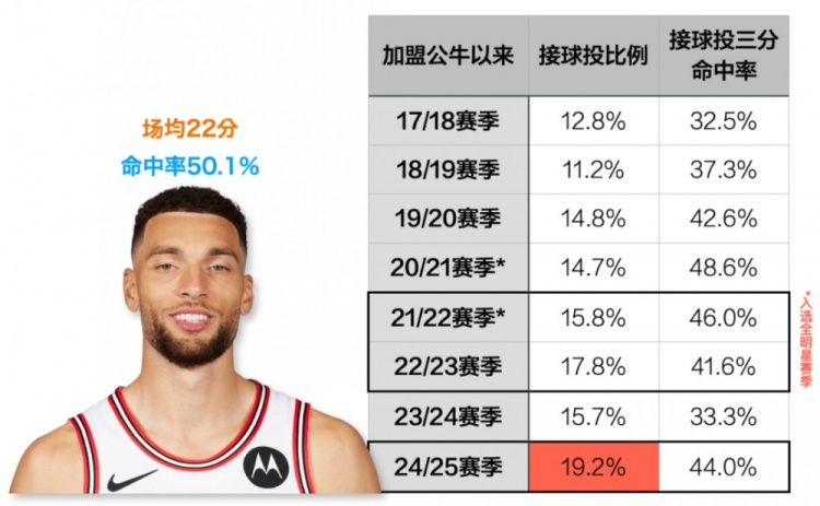 不難看出,拉文本賽季重回巔峰,某種程度上也是找回了自己最適合當(dāng)下籃球風(fēng)潮的版本。賽季至今他有19.2%的出手通過“接球投”完成,而這個數(shù)字不僅是兩連全明星后的新高,也是公牛生涯的新高。