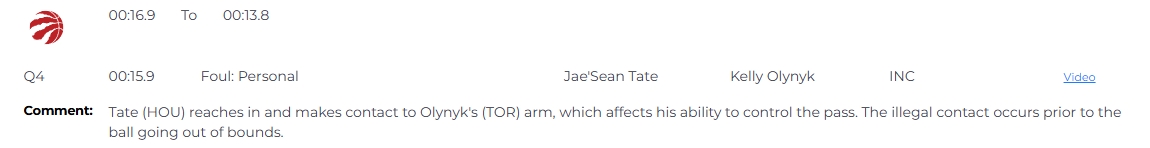 裁判報告表示,泰特打到了奧利尼克手臂,影響了后者對球的控制能力,而這次非法接觸發(fā)生在皮球出界之前,這是一次漏判,猛龍本該拿到球權(quán),火箭獲利。