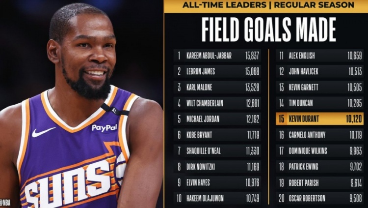 在本場比賽中,杜蘭特的生涯運(yùn)動戰(zhàn)進(jìn)球數(shù)超越卡梅隆-安東尼(10119),上升至NBA歷史第15位,排在他前面的是鄧肯。
