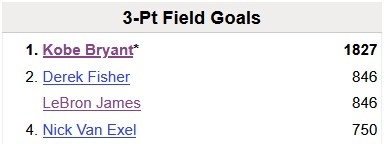 在他身前的是科比,他共投進(jìn)了1827個(gè)三分。