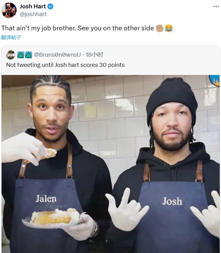 哈特轉(zhuǎn)發(fā)該網(wǎng)友推特并回復(fù)道:“(得30分)不是我的工作兄弟,咱們另一條賽道見?