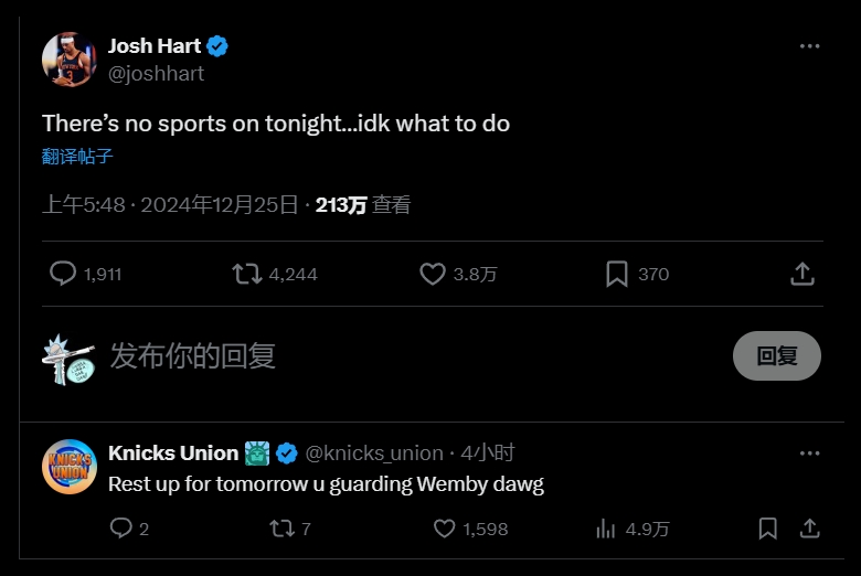 最高贊網(wǎng)友回復(fù)寫(xiě)道:“好好休息,明天你要防守文班亞馬兄弟!”