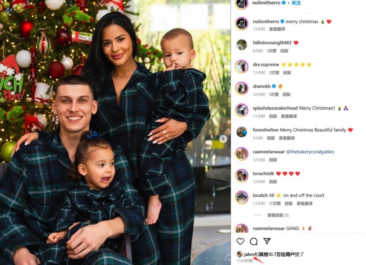 12月25日訊 今天,熱火后衛(wèi)希羅曬出了他的圣誕全家福。火箭球員杰倫-格林進行了點贊。