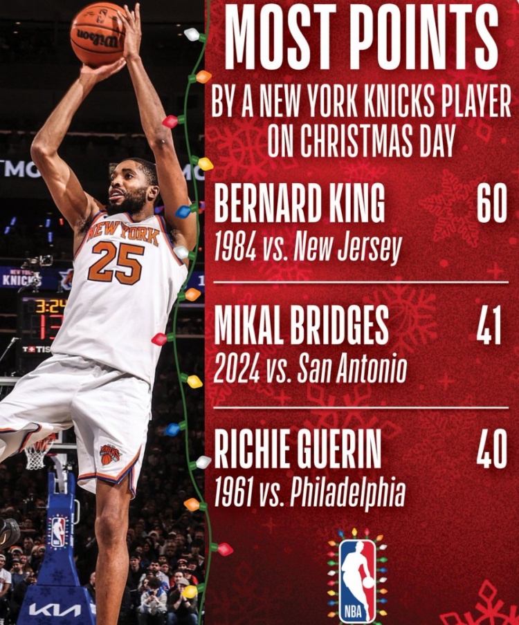 據(jù)統(tǒng)計,41分是尼克斯隊(duì)史圣誕大戰(zhàn)單場第二高分,僅次于伯納德-金(60分)。
