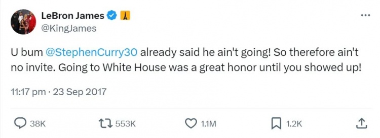 詹姆斯和特朗普的梁子越結(jié)越深。2017年勇士奪冠,史蒂芬-庫里表態(tài)不想訪問白宮,特朗普干脆撤回了對冠軍隊的邀請。詹姆斯在社交媒體上直接貼臉開大:“你這個白癡,庫里已經(jīng)說不會去,就別扯什么邀請了。在你出現(xiàn)之前,訪問白宮是我莫大的榮幸。”這條推特最終獲得119萬次點贊和55萬次轉(zhuǎn)發(fā),是當年最受歡迎的運動員推文。