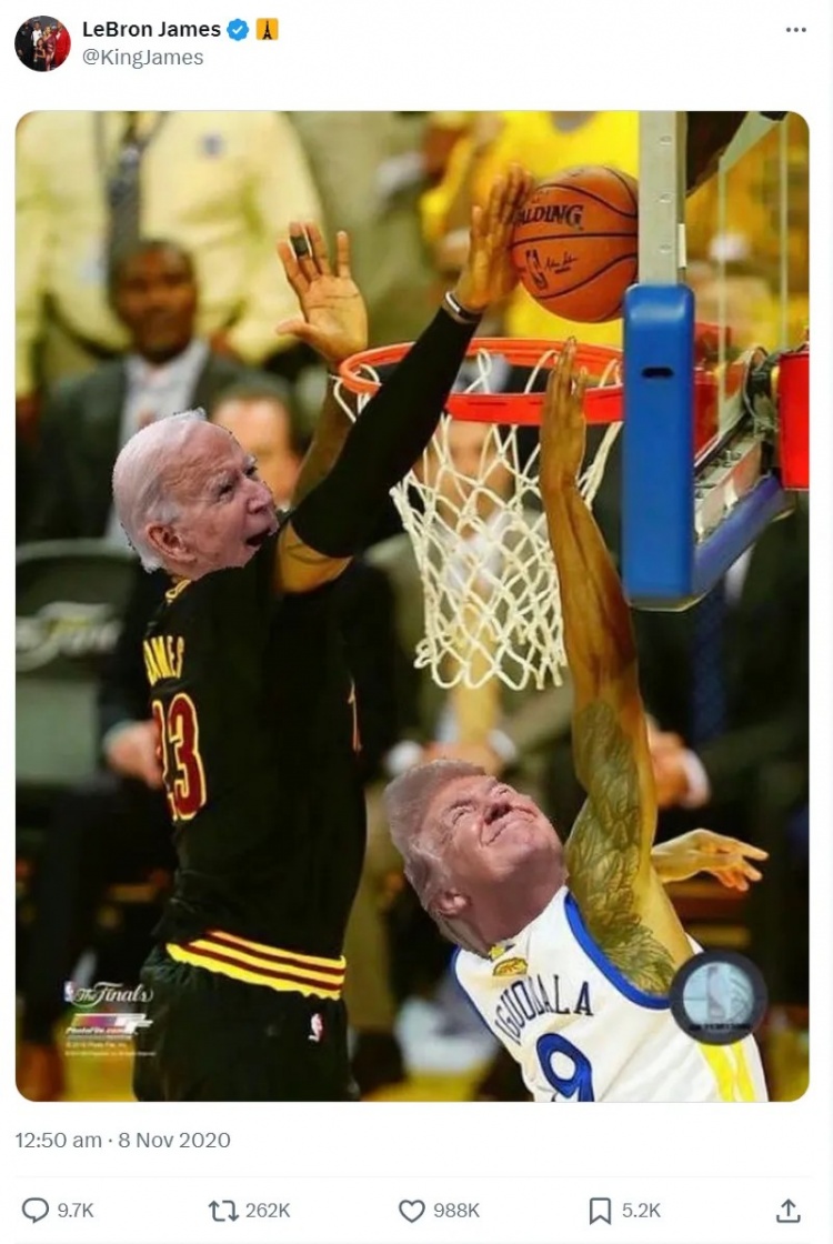對大多數(shù)NBA球員來說,這是一道無腦選擇題。作為聯(lián)盟最老的球員,詹姆斯給出了標準答案。11月1日,詹姆斯發(fā)了一條推特:“我們到底在討論什么?考慮到我的家人和孩子,以及他們的成長背景,我的選擇顯而易見。給卡馬拉-哈里斯投票吧!”