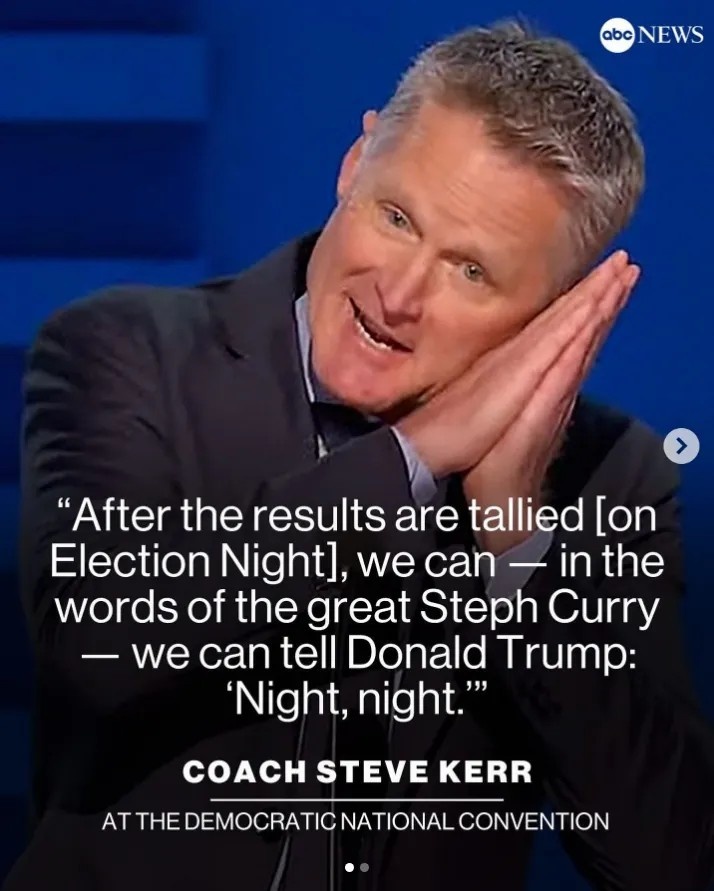 今年8月,科爾受邀在民主黨全國代表大會上演講,稱特朗普會輸?shù)舸筮x,同時模仿了弟子庫里著名的“晚安”手勢,這個動作贏得了熱烈的掌聲,并在社交媒體上瘋傳。