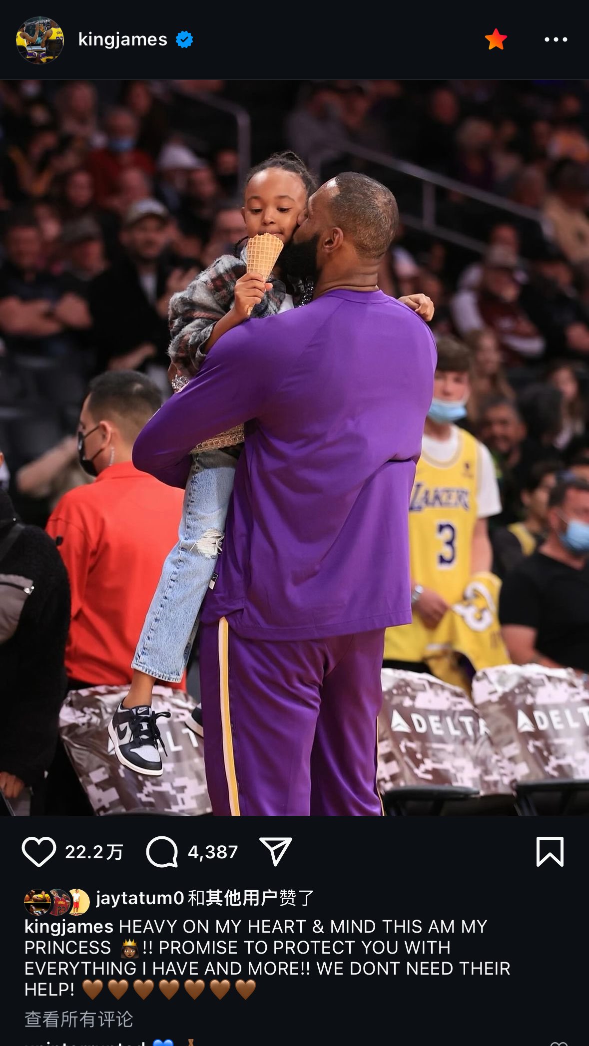 湖人球星詹姆斯更新個人Ins,曬出了自己和女兒朱莉的親密合照,配文寫道:“心情非常沉重&想到了我的公主 標(biāo)簽: NBA  籃球  湖人  詹姆斯