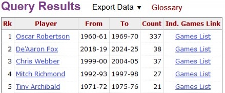 據(jù)統(tǒng)計(jì),這是福克斯生涯第39次單場砍下至少30+5+5,排名國王隊(duì)史第二,僅次于奧斯卡-羅伯特森的337場。