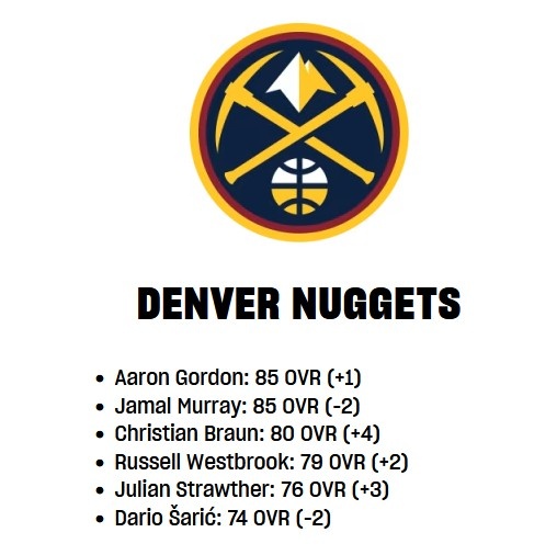 掘金方面,近期表現(xiàn)出色的威少+2漲至79,布勞恩+4躍升至80,斯特勞瑟+3來到76,阿隆-戈登+1到了85。