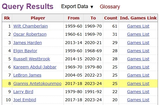 據(jù)統(tǒng)計,這是字母哥生涯第26次單場至少砍下40分10籃板5助攻,超越詹姆斯和賈巴爾排名歷史第6。