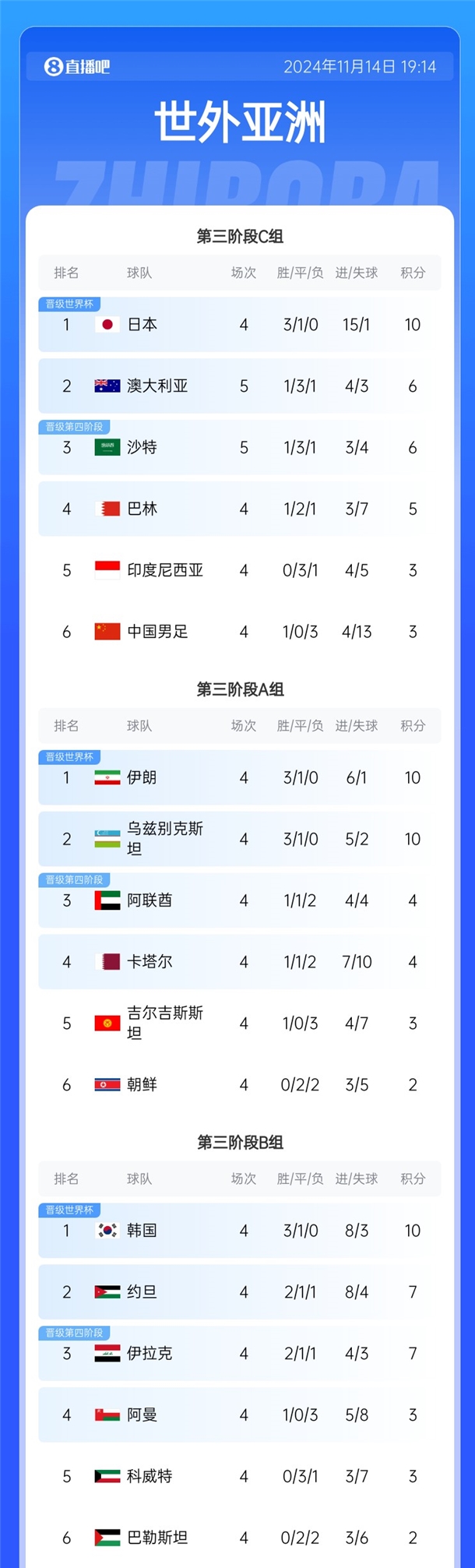 11月14日訊 世界杯亞洲區(qū)預(yù)選賽18強(qiáng)賽C組先賽一場(chǎng),澳大利亞主場(chǎng)0-0戰(zhàn)平沙特?!扼w壇周報(bào)》記者馬德興更新社媒談到自己對(duì)小組積分榜的看法。